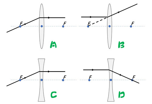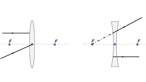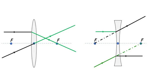 平行于主光轴的光线,经凹透镜折射后反向延长线通过虚焦点,经凸透镜折射后折射光线通过焦点;