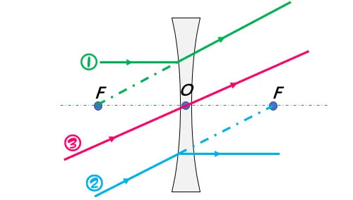 ①平行于主光轴的光线,经凹透镜折射后发散,发散光线的反向延长线通过焦点
