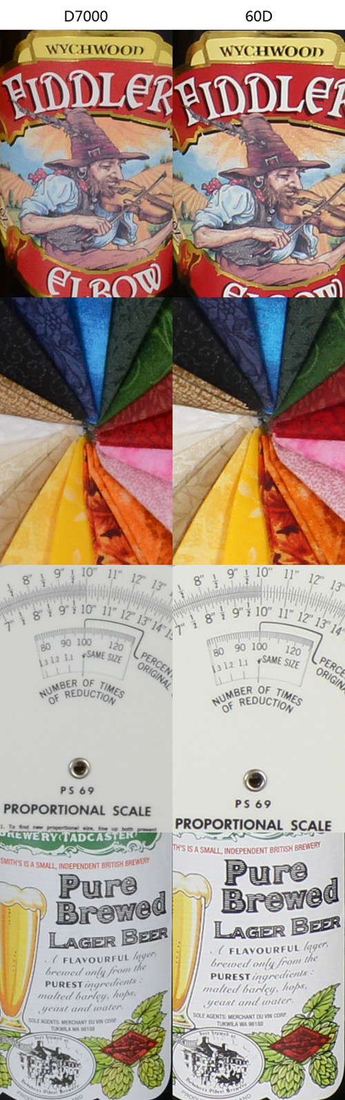 尼康d7000和佳能60d对比样片来自Imaging Resource标准测试样片,采用100%截图,拍摄条件为1/80s,f/8,默认模式,均关闭机内降噪(或最低程度降噪)。对比自ISO 400至ISO 12800(60D最高感光度)。大家可以亲自验证这两款中端机型的实际表现。