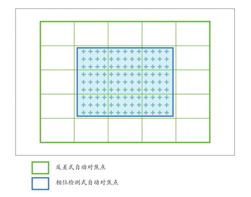 SONY A7的对焦系统,包含25点反差式与相位检测式两种。
