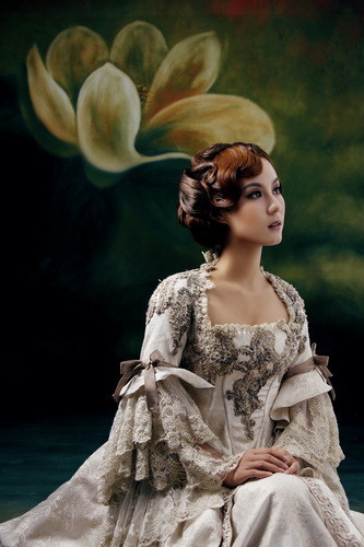 上图的画意照片中,背景上主要的图案是朵大花,我们就可以刻意安排美姿在花朵的斜下方来和图案构成对角关系,调整时同时拉动裙摆使裙摆头部构成另一侧的对角,这样的安排可以使画面更为静态和稳定。在商业拍摄中,有很多背景上的图案不是平均分布的,我们可以调整人物的位置和高度来和背景的图案相呼应。文章源自:https://www.tuzier.com/兔子摄影网-https://www.tuzier.com/1934.html