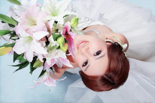 上图中,我使用高机位来俯拍,为了使画面的构图更加饱满,我让模特把手捧花放在画面的边角上,并调整模特的脸部转成斜线和手捧花一起构成画面的对角线。文章源自:https://www.tuzier.com/兔子摄影网-https://www.tuzier.com/1934.html