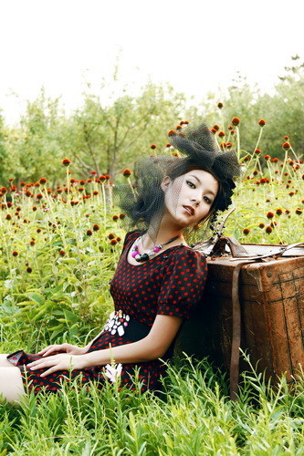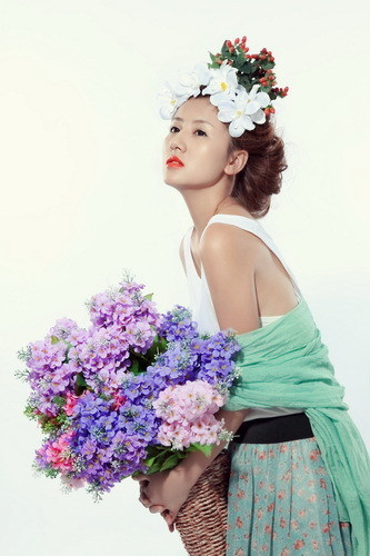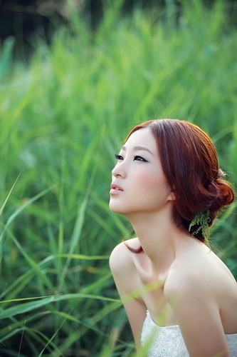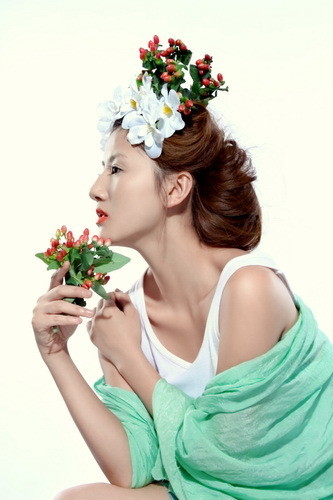 上图通过模特前倾的美姿使画面构成左上角和右下角的呼应,同时手中的花和抬起的脸部构成画面右上角和左下角的呼应。这种双对角线的拍摄也是我们常用的一种,往往需要我们在取景框里调整美姿的幅度来使之达到构图的精准。