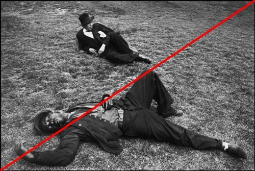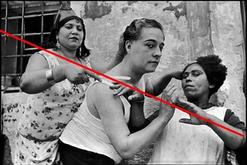 这是 Henri Cartier-Bresson 在法国马赛拍的一张照片。照片中的两个男人正在享受他们的假期。你能看到这张照片当中的对角线吗?现在我们先画一条对角线吧: