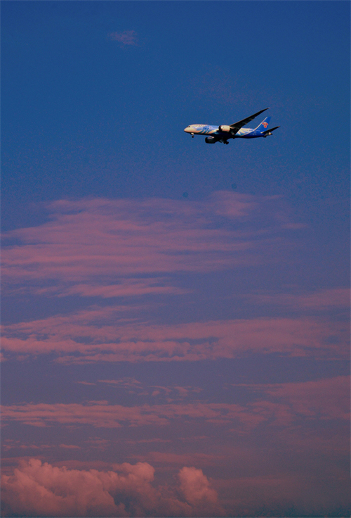 天空与晚霞是蓝色和橙色对比的绝佳拍摄对象,为画面安排飞行的飞机,可以使画面不再单调。
