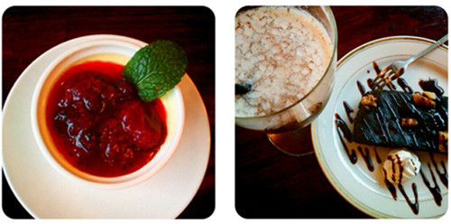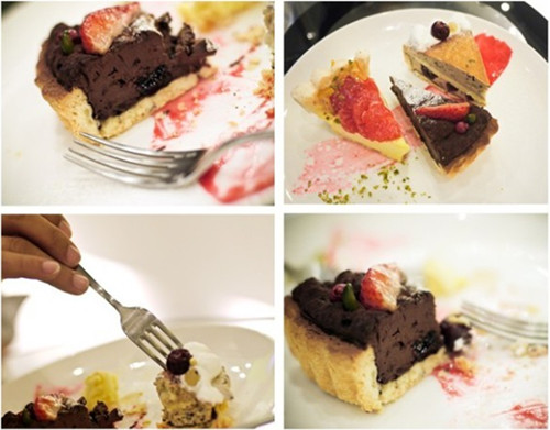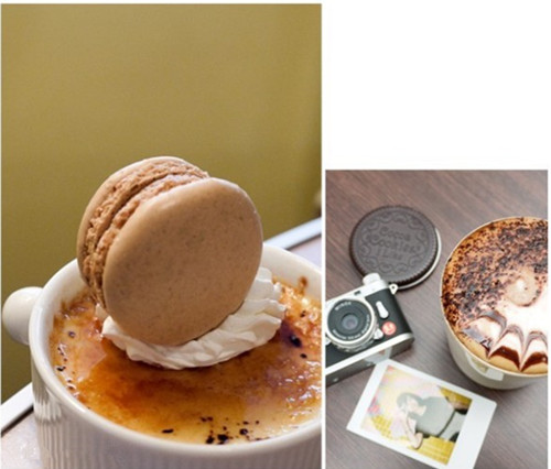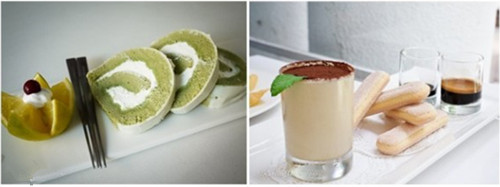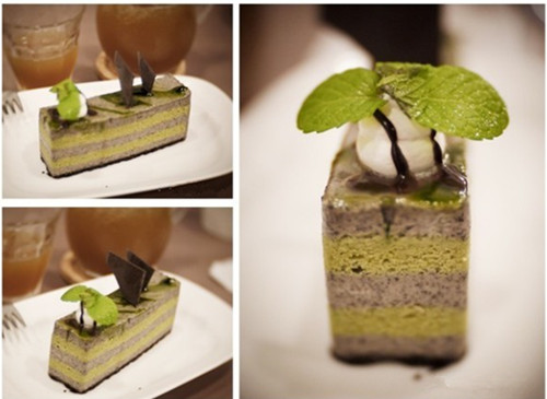 不同的拍摄角度,会呈现出不一样的感觉,试着找出有趣的一面。转动盘子或者移动位置。 如下图,左方图片的拍摄方式很普通,属于过目即忘的影像,把盘子转到侧面,发现这一块抹茶蛋糕的侧面与上方装饰的薄荷叶,远远看来好像一个小盆栽,于是拍摄下了右图,暖暖的充满绿意的氛围。