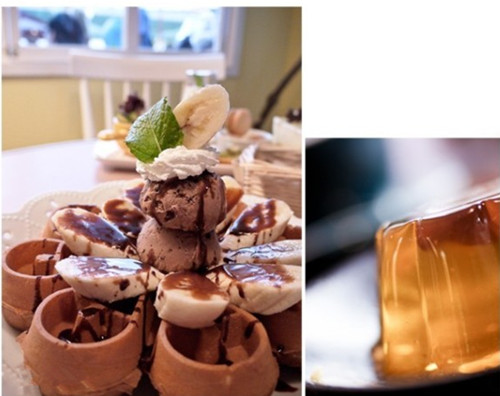 上图的左图利用微微的逆光环境作拍摄,照片中主要是以室内的暖调光源,也因为白平衡以室内为主,后方窗外的自然光呈现偏冷调的蓝色,窗外的光线将主体边缘勾勒出清晰轮廓,也让食物上增添许多光泽。 拍摄半透明的果冻,用逆光才好呈现出剔透的感觉。文章源自:https://www.tuzier.com/兔子摄影网-https://www.tuzier.com/2748.html