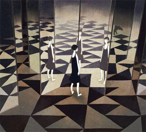 用面积偏小的镜子倒映出身体的局部细节,让它们在画面中更加突出,实现非具象、非理性的抽象视觉,破碎不堪的镜子更适合表达悲观情绪。