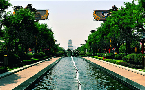 从前方拍摄喷泉水池。