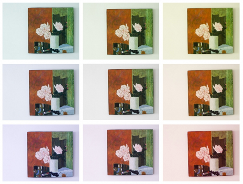 实验拍摄对象是挂在墙上的一幅小品,光线是窗外的散射光。分别将白平衡漂移点放在中央、四个边上(离边缘差一个点)、以及四个角上,得到9幅图像如下:文章源自:https://www.tuzier.com/兔子摄影网-https://www.tuzier.com/5021.html
