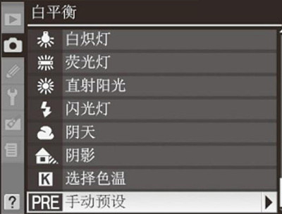 在数码相机的自定义白平衡设置中,一般会预设几种光源的色温,适应不同的光源要求,以供用户进行选择。一般消费级的家用数码相机有白炽灯,荧光灯,日光,阴天,多云等几种模式。有时候,拍摄环境较为复杂,相机的自动白平衡会判断失误,产生偏差。