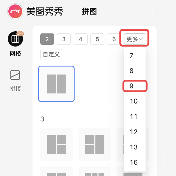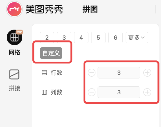 常见的朋友圈九宫格拼图,用【网格】就可以轻松实现哦。在【更多】里选择“9”宫格,或【自定义】里行数与列数分别输入“3”,再导入图片即可拼出九宫格。文章源自:https://www.tuzier.com/兔子摄影网-https://www.tuzier.com/54312.html