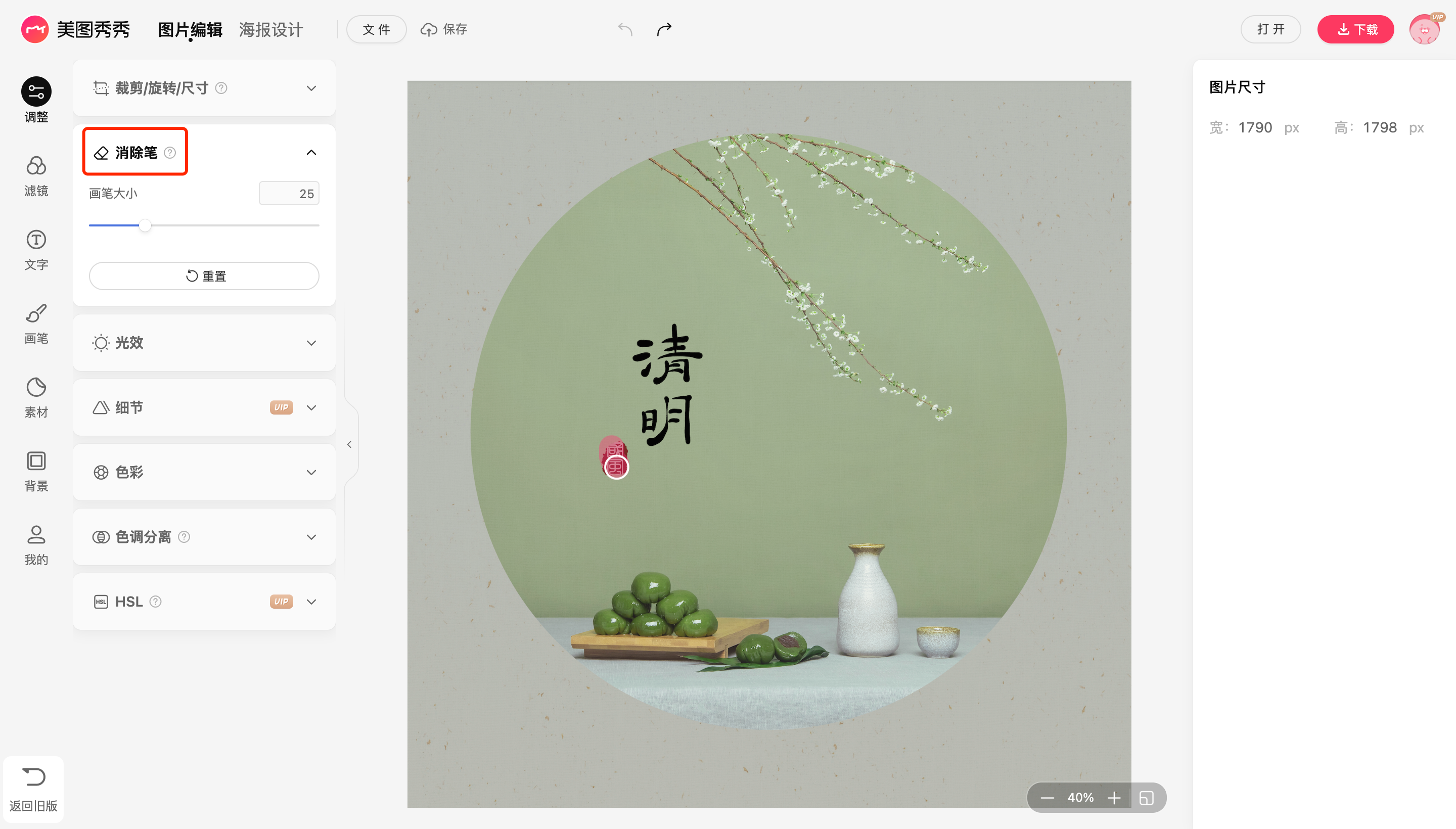 更多消除笔应用场景:去除图片中的多余人物、去除痘痘、去除照片中多余的物品,见 消除笔功能教程。
