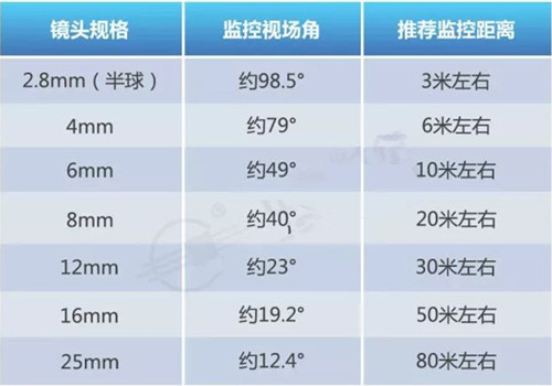 对于监控摄像机镜头选择的问题,监控距离推荐,不同摄像机的视场角数值不同,监控距离也不同,请参考下图。