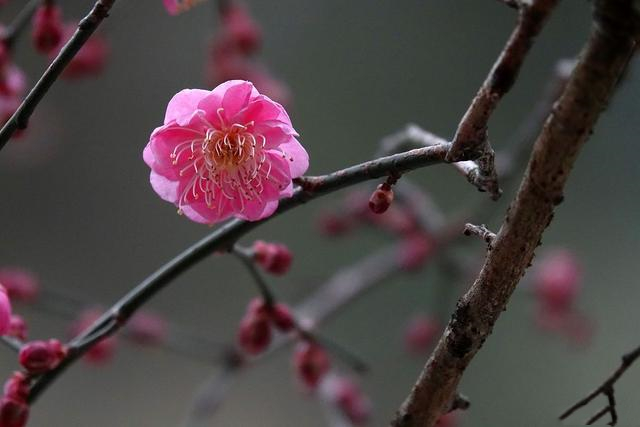 九宫格的四条线的四个交点也是视觉重点,实拍中往往将主体的中心安排在这四个交点之中的一个交点上。如上图就将花卉安排在四个交点的左上交点上。那么这里有四个交点,为何独独放在左上的交点上呢?我们仔细看一下花卉的朝面是偏向下的,这样安排在上面的交点上,下面有更多的空间,视觉上会感到比较开阔,如果放在下面的交点上就会有一种局促和压抑的感觉,至于放在左边的交点,主要是考虑到取入右边树枝的需要。