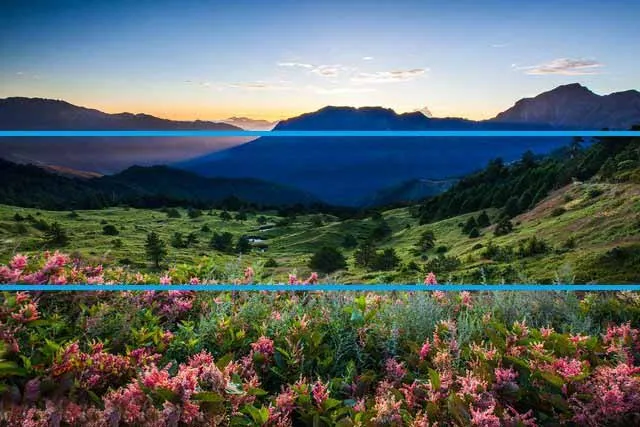 在表现自然风光中经常会用到,比如说根据地平线、海平线来构图,可以表现出自然景色的辽阔、浩瀚。为了使画面稳定感较强,不要把物体放在画面正中央,要使其处于偏上或偏下的位置,同时,安排好各个物体的位置,尽量形成层次感。