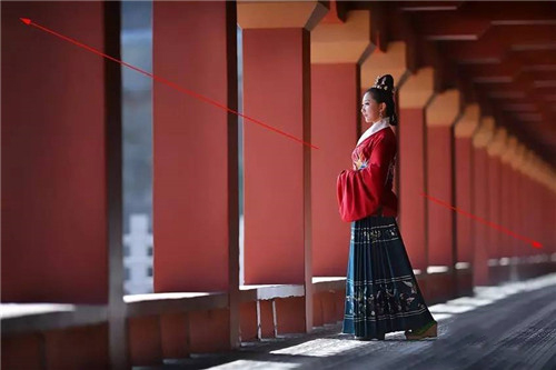 人物的动作和眼神,与背景的长廊呈一对角线,延伸了视觉和空间感。