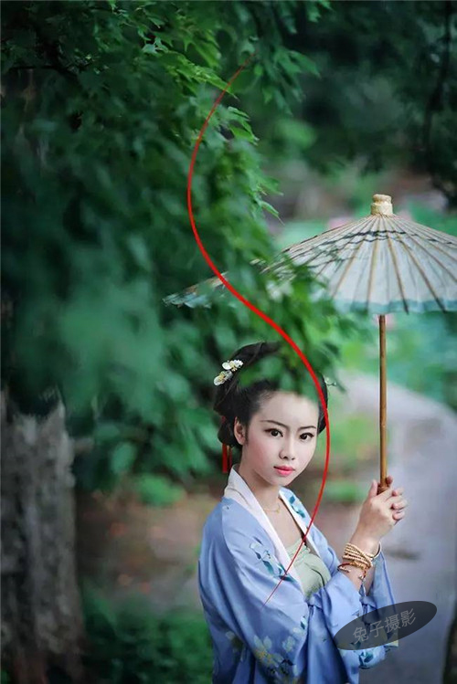 用景物的框架做前景,能增加画面的纵向对比和装饰效果,使照片产生深度感。常应用于古建筑、园林等环境人像。