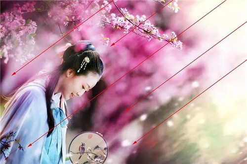 利用花枝和风的吹动斜线构图来表达人物的情绪和树枝的吹动。