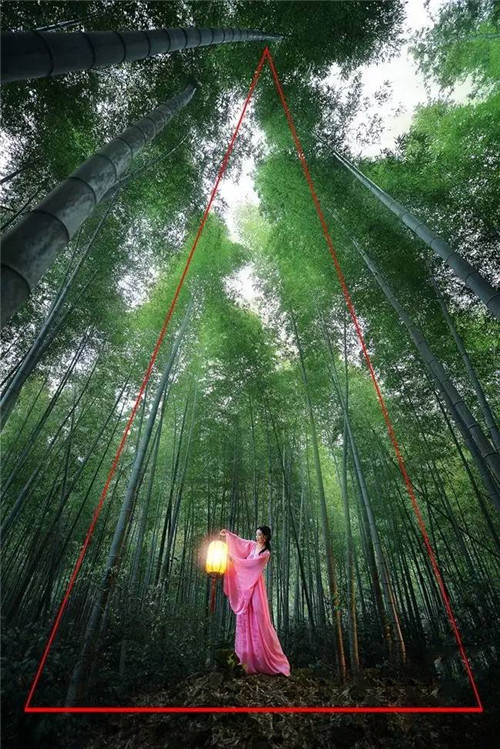 “正三角”构图:利用广角镜头的视觉和环境竹林枝杆的视觉变形来表现。