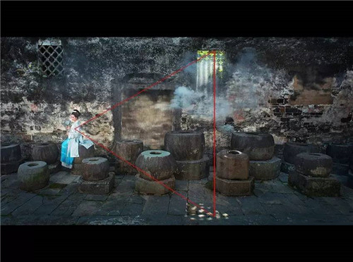 “斜三角”构图:利用广角镜头的视觉和环境中的光影和衬托亮点平衡来表现。