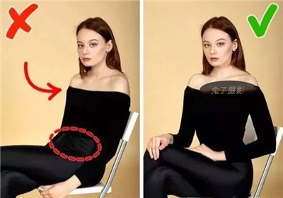 ⑤坐着摆姿势时先要从镜头中去寻找最合适的身体比例,比例适合看起来才会舒服。比如:身体露出来的部位,腿、手臂、腰部等等,千万不要出现因转动挤压而造成皮肉扭曲的线条。