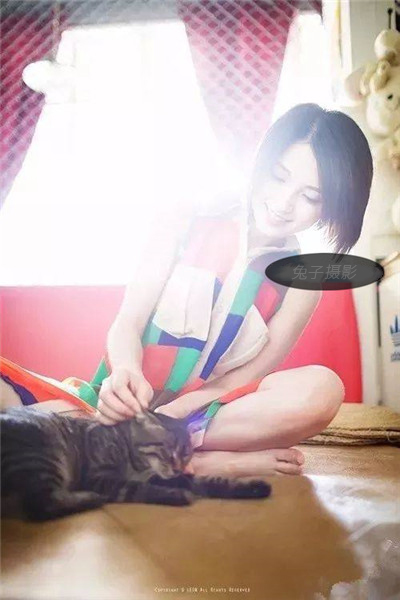 像下面这张照片,选择低角度、逆光拍摄,画面看起来非常清新。而模特身体略微向下倾斜,同时还低下头和猫咪互动,整个画面甜美而清新。