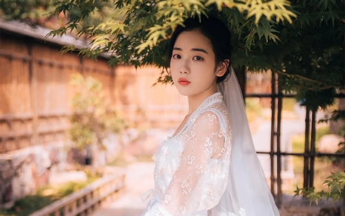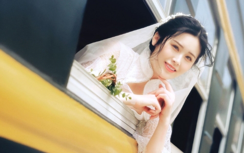 美女婚纱照的服装往往比较简洁、优雅,并且垂感较好,有时候会在婚纱表面加上一层纱,使新娘显得更加柔美、俏皮。