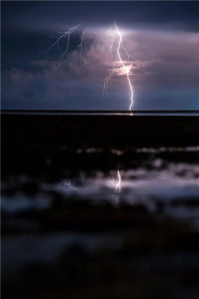 如果只单独拍摄闪电的话,似乎缺少一些变化与多元性,我们可尝试在照片构图中增添一些元素,例如远方建筑物灯火、轮廓及形状,或者地面、水面反射雷电强光,都能创作出令人印象深刻的闪电摄影作品。