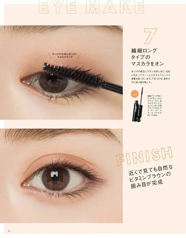 眼妆最后的步骤就是在睫毛,很多女人在用睫毛膏的时候,通常会刷上厚厚一层,将睫毛拉得老长。这样的方式更适合出现的比较浓的妆容中,而在日系裸妆的妆容中,睫毛薄薄地涂一层就可以,与眉毛一样打造出根根分明的既视感,更能在放大双眼的同时让你的妆感自然、不结块。