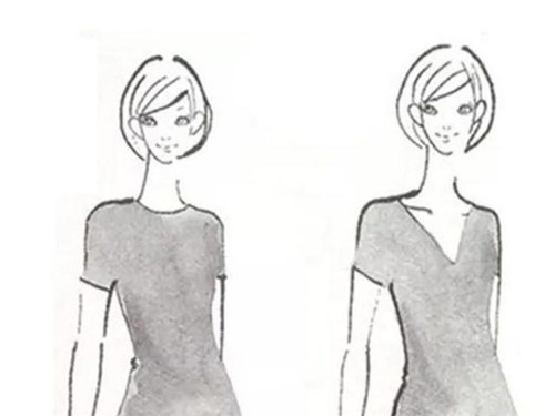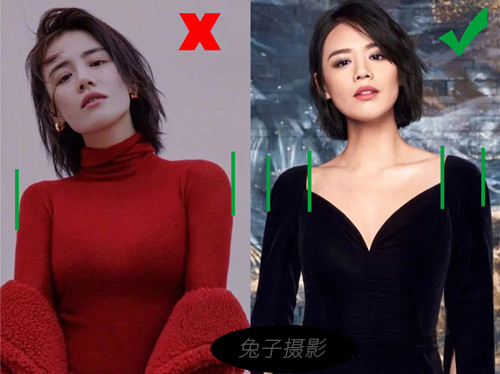 领型切割肩宽,在这里用到的是V字领,它由两条斜线构成,会打断肩线的连贯性,在中间把整体肩部切割成左右两部分,在不经意间就能缩小肩部宽度。