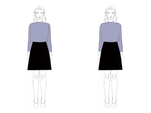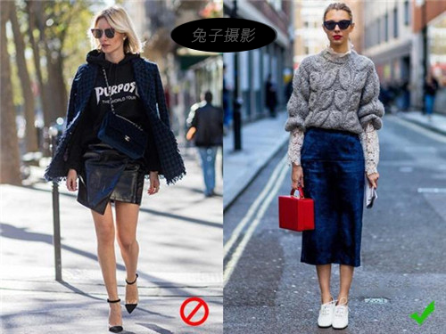 左图同色系的穿法,腰线并不明显,辜负了Y型妹纸纤细腰身的身材优势。右图上衣选择灰色针织衫而下身半身牛仔裙的组合,就能清楚看到腰线在哪里。