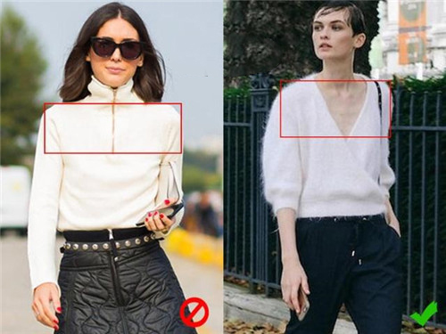 小姐姐穿上左图一身黑之后,腰线也被隐藏了起来,右图那种上下不同色撞色套装,才是Y型妹纸打造成熟风造型的必备款。因此,Y型妹纸一定要记住收腰的重要性呦,借助穿搭显出腰部弧度。