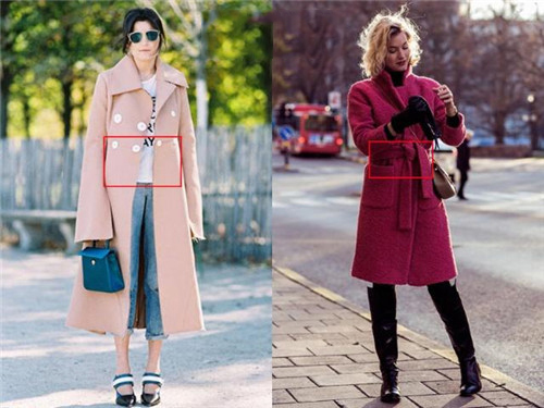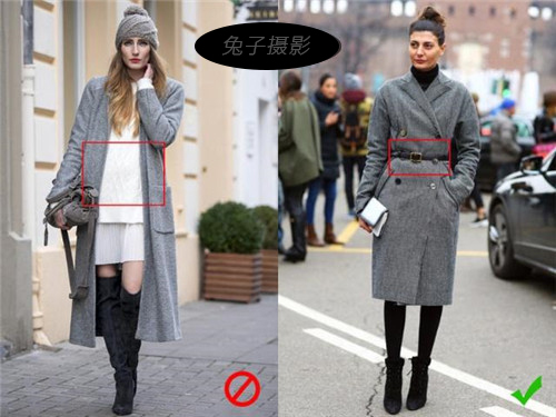 腰线的重要性看上图,左图不系腰带穿衣,整体横向扩张很容易显得矮胖,而右图系腰带大衣上身,腰部收缩尽显弧度美感,造型风格也转变成为优雅的成熟lady。