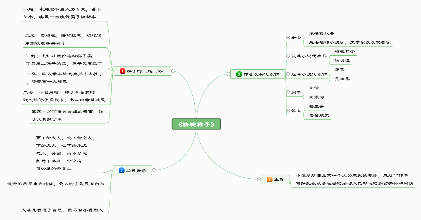 对于《骆驼祥子》这本书,很多学生反复阅读了许多遍,却总是读了就忘,即使是用传统的读书笔记方法,复习的时候要一张张去翻阅也是需要花费不少时间。而骆驼祥子思维导图则可以把大量的知识内容全部用一张纸记忆下来,真正做到了把“厚”书读“薄”,下面我们用一张骆驼祥子思维导图来对整书进行一个大体的概括。文章源自:https://www.tuzier.com/兔子摄影网-https://www.tuzier.com/sheying/20635.html