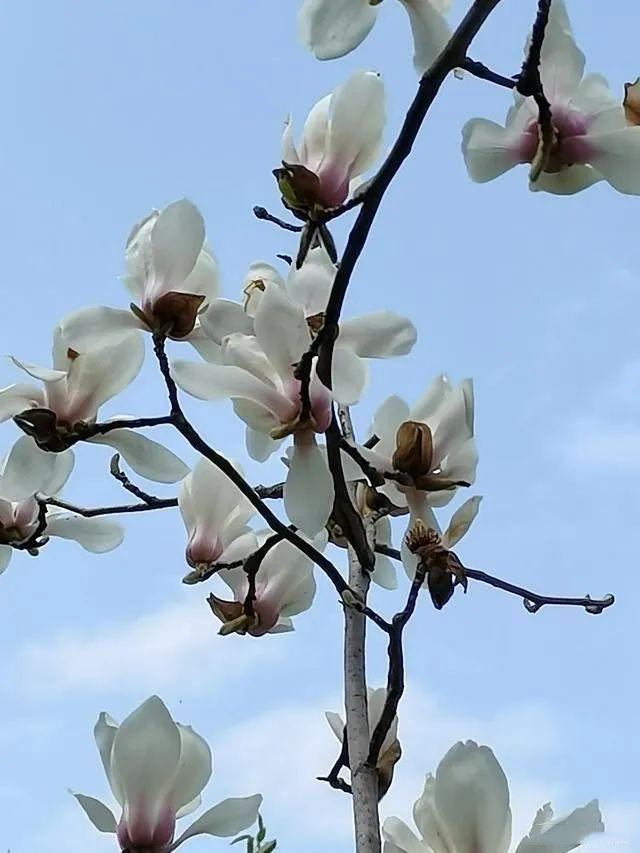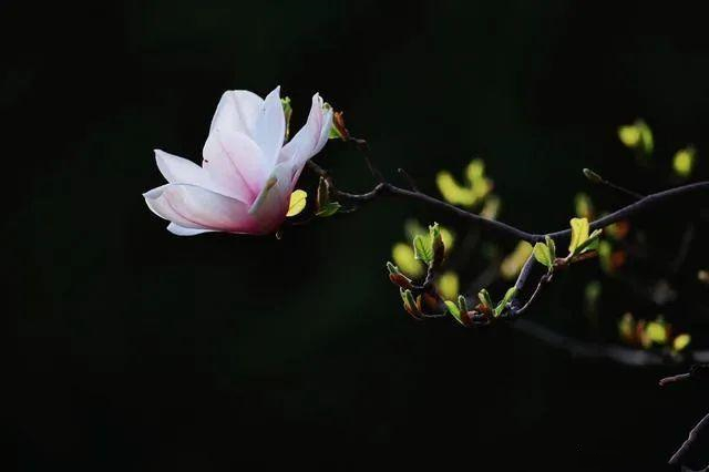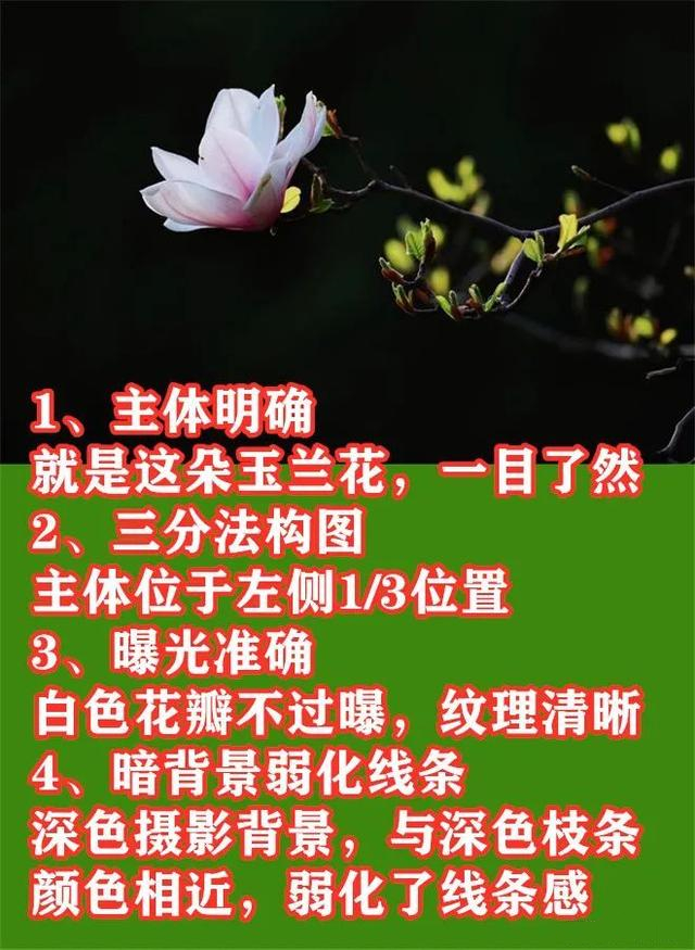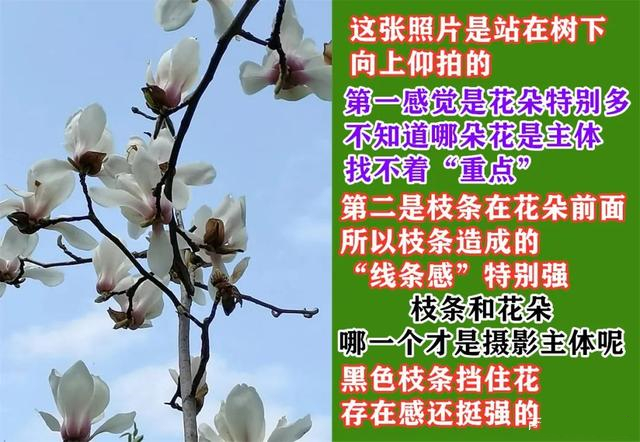 玉兰花的枝条颜色挺深,很容易形成“线条感”。如果摄影背景也是深色的,那么同样是深色的枝条,线条感就会很弱。这也有利于突出摄影主体。