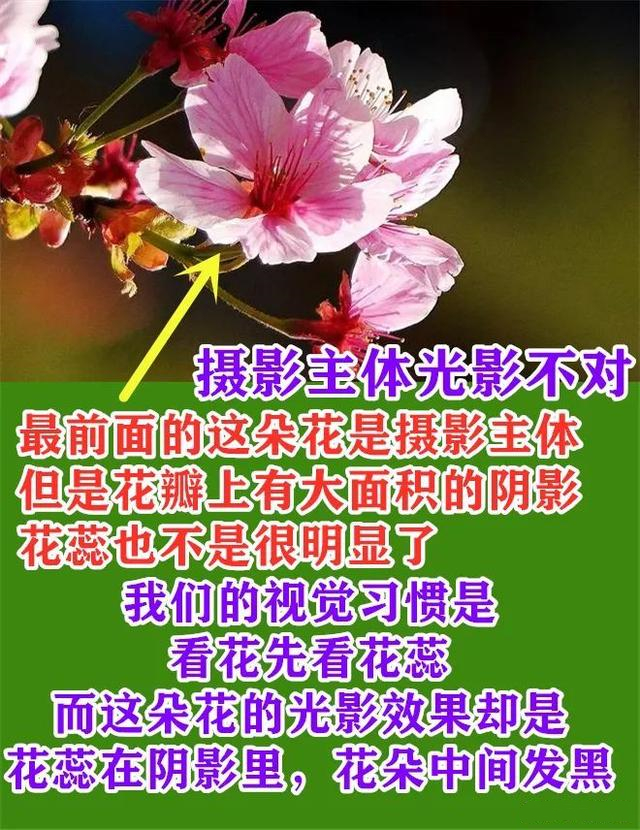 和上一张照片相比,这张照片的问题就比较明显了。首先,是设定主题上边的光影不对。我们看花的习惯是先看花蕊。离镜头最近的这朵花,应该是摄影主体。但是,这朵花有一大半都在阴影里。花朵中间发黑,导致花蕊不明显。主体上边有大面积的阴影,确实挺影响拍摄效果的。