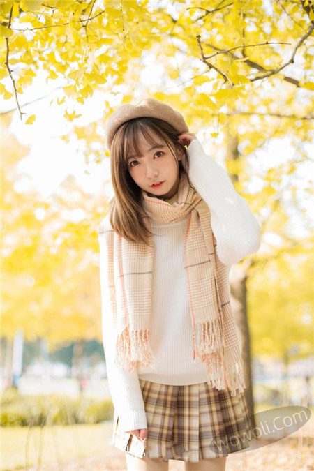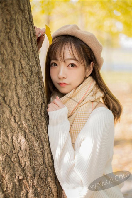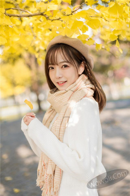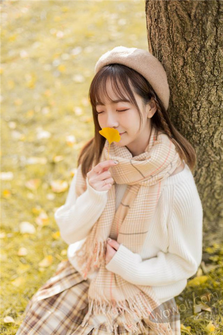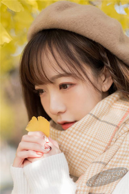 手拿拍照道具,就像下面模特,手拿一片落叶,和它来一个亲密互动,放在嘴唇上,闻着大自然的味道,闭上双眼,也可以避免眼光无神的尴尬。