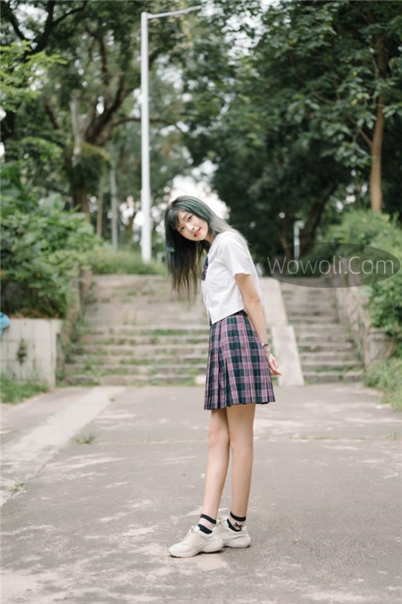 抬起一条腿,单脚站着拍照,一只手撩头发,一只手轻碰鞋子,这个拍照动作,绷直脚面,腿显得长,三角跟L型的构图方式,很好地增加了画面稳定性。