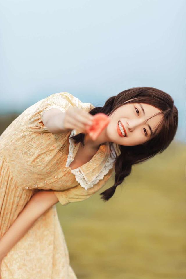 想要更显自然好看,不妨和镜头互动起来,像有水果、鲜花、饮料等道具时,你就可以拿在手上向镜头递过去,一来画面会更丰富有趣,二来也能和镜头及观众互动起来,拍照很有清新少女感。